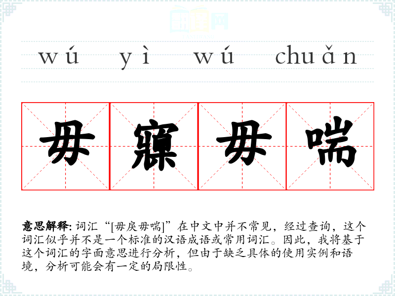 词汇“[毋戾毋喘]”在中文中并不常见,经过查询,这个词汇似乎并不是一个标准的汉语成语或常用词汇。因此,我将基于这个词汇的字面意思进行分析,但由于缺乏具体的使用实例和语境,分析可能会有一定的局限性。