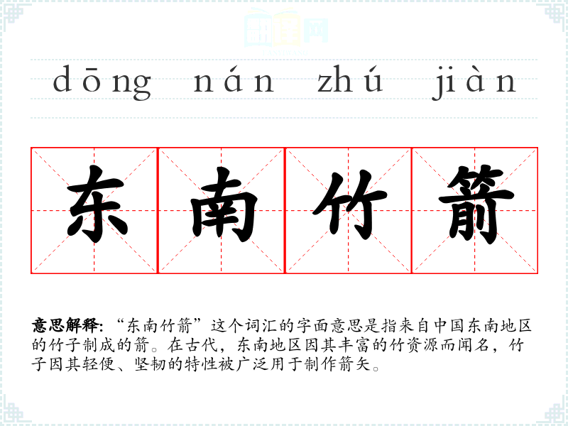 “东南竹箭”这个词汇的字面意思是指来自**东南地区的竹子制成的箭。在古代,东南地区因其丰富的竹资源而闻名,竹子因其轻便、坚韧的特性被广泛用于制作箭矢。
