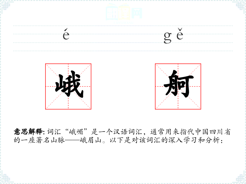 - 反义词:平原、低地(这些词汇与“峨嵋”所代表的高耸山峰形成对比)