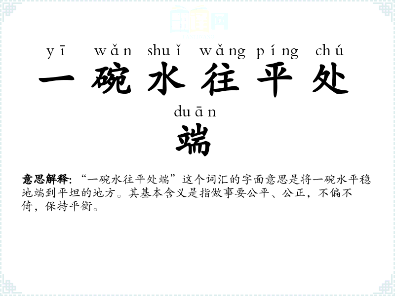 “一碗水往平处端”这个词汇的字面意思是将一碗水平稳地端到平坦的地方。其基本含义是指做事要公平、公正,不偏不倚,保持平衡。