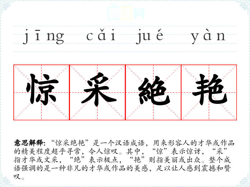在英语中,类似的表达可能是“stunningly brilliant”或“exceptionally beautiful”,虽然它们也能传达出非凡的才华和美感,但“惊采绝艳”这个成语在汉语中特有的韵味和表达力是难以完全翻译的。