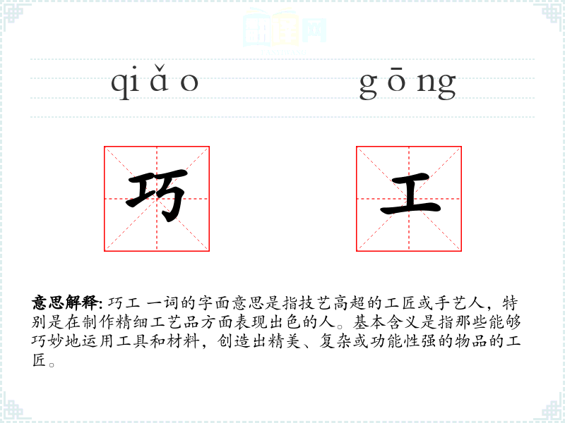 巧工 一词的字面意思是指技艺高超的工匠或手艺人,特别是在制作精细工艺品方面表现出色的人。基本含义是指那些能够巧妙地运用工具和材料,创造出精美、复杂或功能性强的物品的工匠。