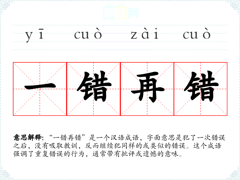 “一错再错”是一个汉语成语,字面意思是犯了一次错误之后,没有吸取教训,反而继续犯同样的或类似的错误。这个成语强调了重复错误的行为,通常带有批评或遗憾的意味。