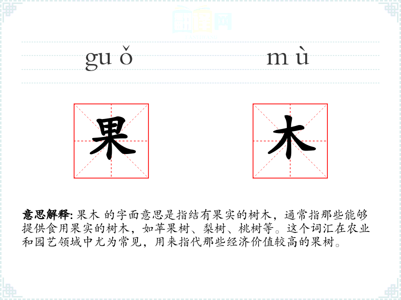 - 反义词:非果木(如松树、柏树等不结果实的树木)