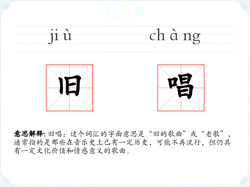 旧唱:这个词汇的字面意思是“旧的歌曲”或“老歌”,通常指的是那些在音乐史上已有一定历史,可能不再流行,但仍具有一定文化价值和情感意义的歌曲。