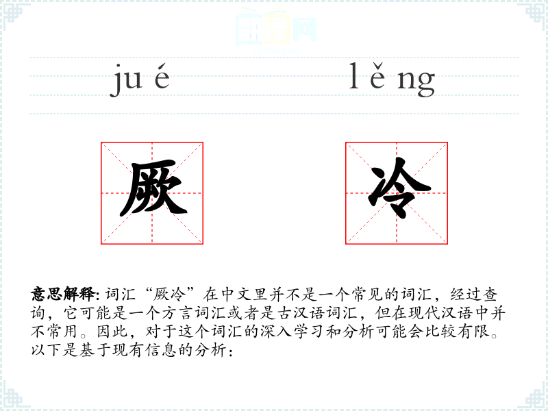 “厥”在古汉语中有突然、昏厥的意思,而“冷”则是寒冷。这两个字组合在一起,可能是用来形容一种突然的寒冷感。随着语言的发展,这样的词汇可能逐渐被更常用的词汇所替代。