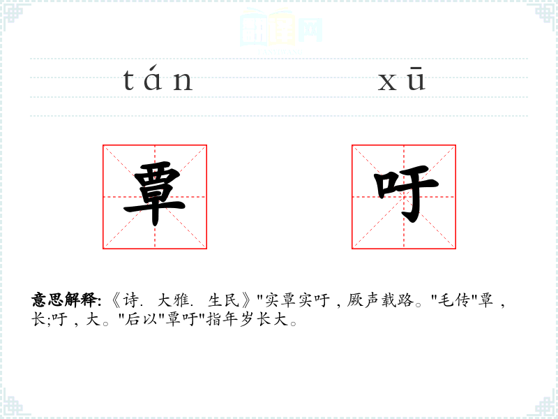 《诗.大雅.生民》"实覃实吁﹐厥声载路。"毛传"覃﹐长;吁﹐大。"后以"覃吁"指年岁长大。