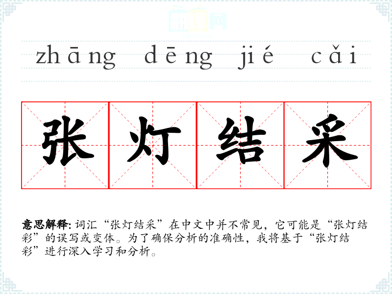 词汇“张灯结采”在中文中并不常见,它可能是“张灯结彩”的误写或变体。为了确保分析的准确性,我将基于“张灯结彩”进行深入学*和分析。