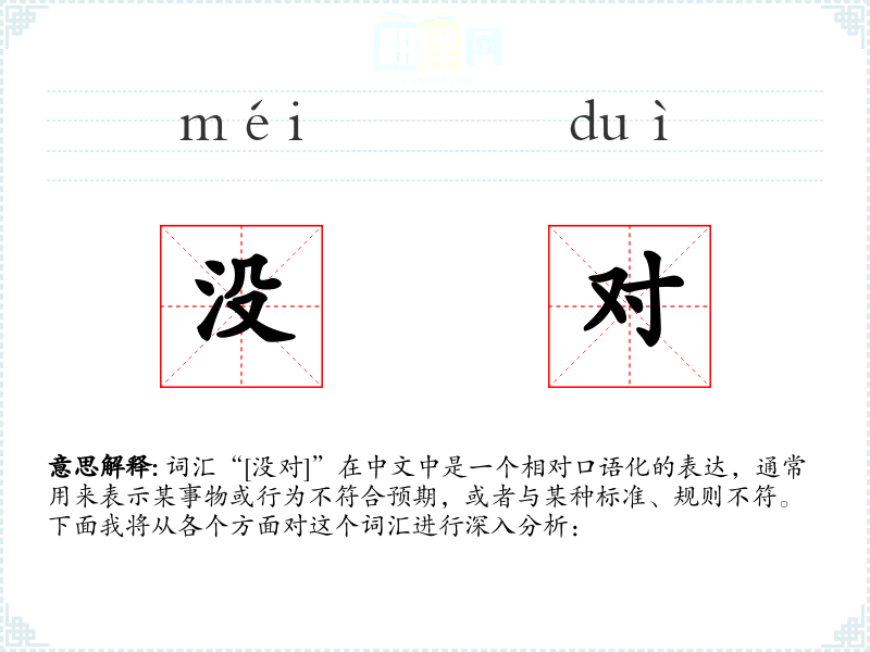 词汇“[没对]”在中文中是一个相对口语化的表达,通常用来表示某事物或行为不符合预期,或者与某种标准、规则不符。下面我将从各个方面对这个词汇进行深入分析: