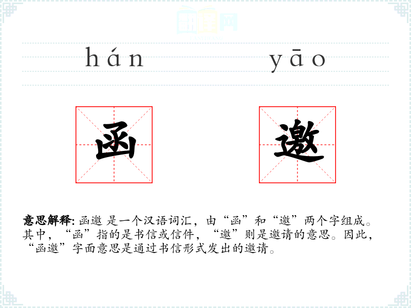 函邀 是一个汉语词汇,由“函”和“邀”两个字组成。其中,“函”指的是书信或信件,“邀”则是邀请的意思。因此,“函邀”字面意思是通过书信形式发出的邀请。