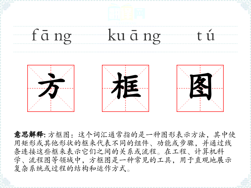 - 反义词:无(方框图是一个描述性词汇,没有直接的反义词)