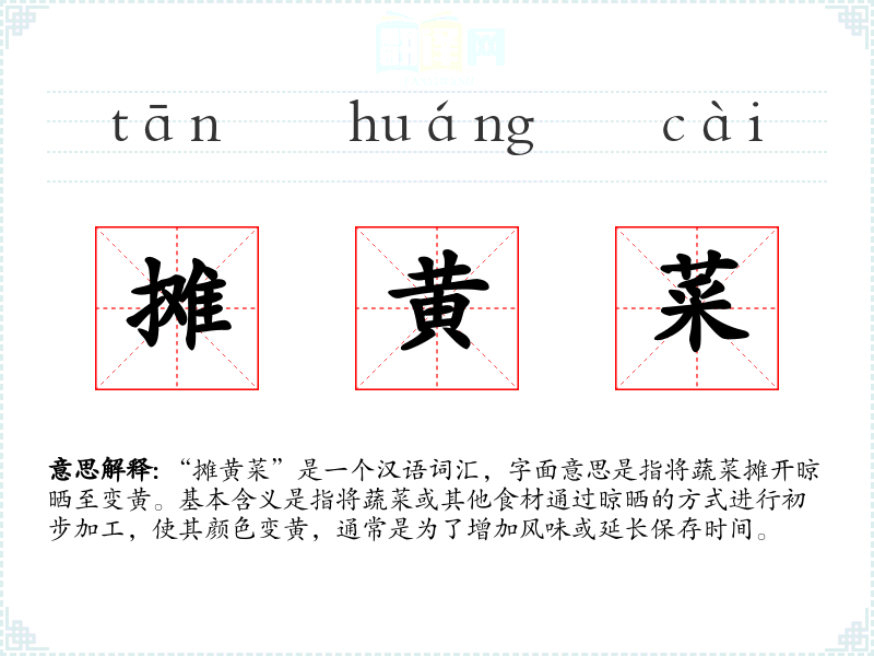 “摊黄菜”是一个汉语词汇,字面意思是指将蔬菜摊开晾晒至变黄。基本含义是指将蔬菜或其他食材通过晾晒的方式进行初步加工,使其颜色变黄,通常是为了增加风味或延长保存时间。