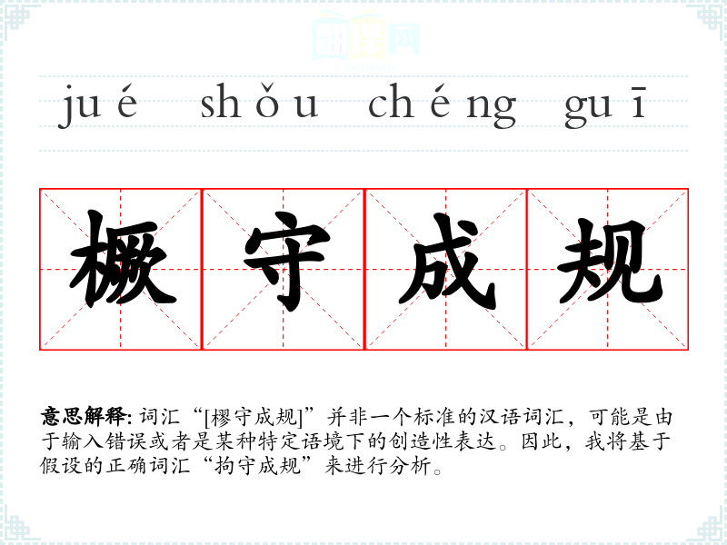 词汇“[樛守成规]”并非一个标准的汉语词汇,可能是由于输入错误或者是某种特定语境下的创造性表达。因此,我将基于假设的正确词汇“拘守成规”来进行分析。