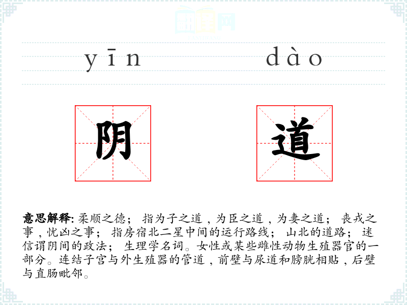 1.柔顺之德; 指为子之道﹐为臣之道﹐为妻之道; 丧戎之事﹐忧凶之事; 指房宿北二星中间的运行路线; 山北的道路; 迷信谓阴间的政法; 生理学名词。女性或某些雌性动物生殖器官的一部分。连结子宫与外生殖器的管道﹐前壁与尿道和膀胱相贴﹐后壁与直肠毗邻。