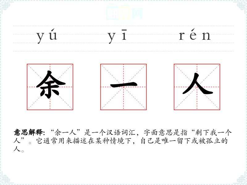 - 口语:在日常对话中,这个词可能用来表达自己在某个群体中的孤立感,如“聚会结束后,大家都走了,余一人留在原地”。