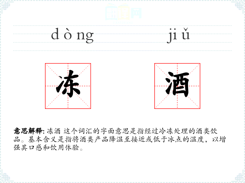 冻酒 这个词汇的字面意思是指经过冷冻处理的酒类饮品。基本含义是指将酒类产品降温至接近或低于冰点的温度,以增强其口感和饮用体验。