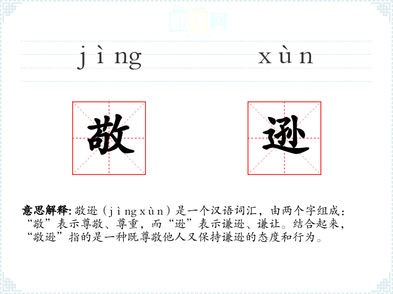 “敬”字最早见于甲骨文,原意是用手持酒器祭祀,后引申为尊敬。“逊”字古文作“遜”,意为退让、谦让。两个字结合形成“敬逊”,强调在尊敬他人的同时保持谦让的态度。