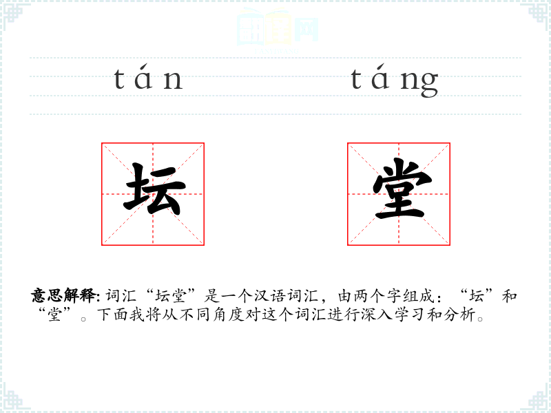 词汇“坛堂”是一个汉语词汇,由两个字组成:“坛”和“堂”。下面我将从不同角度对这个词汇进行深入学*和分析。