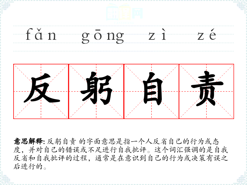 反躬自责 的字面意思是指一个人反省自己的行为或态度,并对自己的错误或不足进行自我批评。这个词汇强调的是自我反省和自我批评的过程,通常是在意识到自己的行为或决策有误之后进行的。