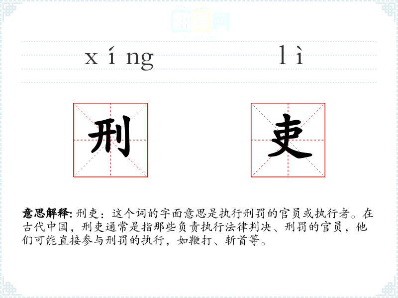 刑吏:这个词的字面意思是执行刑罚的官员或执行者。在古代**,刑吏通常是指那些负责执行法律判决、刑罚的官员,他们可能直接参与刑罚的执行,如鞭打、斩首等。