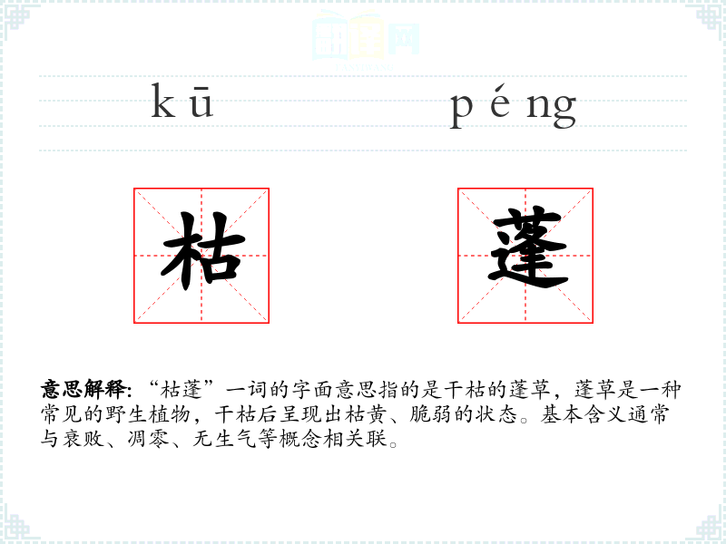 “枯蓬”一词的字面意思指的是干枯的蓬草,蓬草是一种常见的野生植物,干枯后呈现出枯黄、脆弱的状态。基本含义通常与衰败、凋零、无生气等概念相关联。