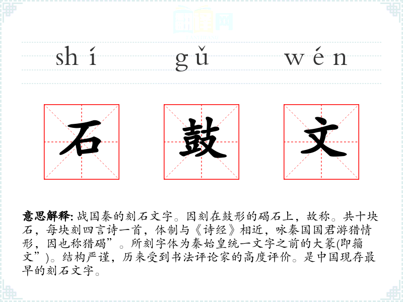 1.战国秦的刻石文字。因刻在鼓形的碣石上,故称。共十块石,每块刻四言诗一首,体制与《诗经》相近,咏秦国国君游猎情形,因也称猎碣”。所刻字体为秦始皇统一文字之前的大篆(即籀文”)。结构严谨,历来受到书法评论家的高度评价。是中国现存最早的刻石文字。