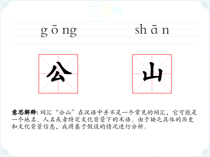 词汇“公山”在汉语中并不是一个常见的词汇,它可能是一个地名、人名或者特定文化背景下的术语。由于缺乏具体的历史和文化背景信息,我将基于假设的情况进行分析。