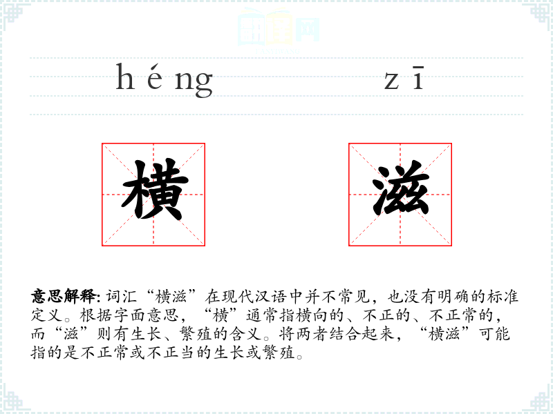 词汇“横滋”在现代汉语中并不常见,也没有明确的标准定义。根据字面意思,“横”通常指横向的、不正的、不正常的,而“滋”则有生长、繁殖的含义。将两者结合起来,“横滋”可能指的是不正常或不正当的生长或繁殖。