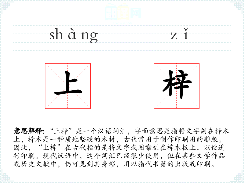 - 反义词:(由于“上梓”特指古代的印刷行为,现代无直接反义词,但可考虑“未出版”、“未印行”等)