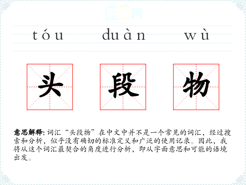 在特定的文化或社会背景中,“头段物”可能指代某种特定的物品或概念,但由于缺乏具体的使用实例,这一部分难以深入分析。