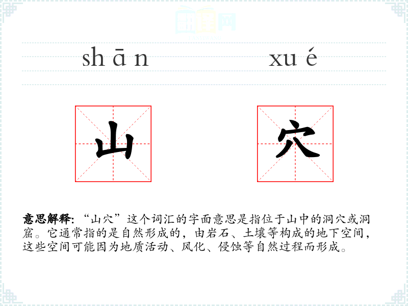 “山穴”这个词汇的字面意思是指位于山中的洞穴或洞窟。它通常指的是自然形成的,由岩石、土壤等构成的地下空间,这些空间可能因为地质活动、风化、侵蚀等自然过程而形成。