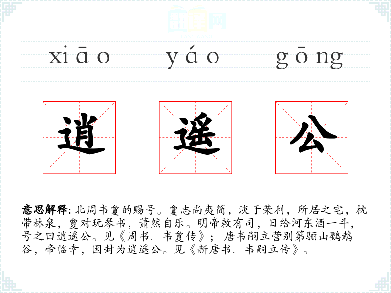 1.北周韦夐的赐号。夐志尚夷简,淡于荣利,所居之宅,枕带林泉,夐对玩琴书,萧然自乐。明帝敕有司,日给河东酒一斗,号之曰逍遥公。见《周书.韦夐传》; 唐韦嗣立营别第骊山鹦鹉谷,帝临幸,因封为逍遥公。见《新唐书.韦嗣立传》。