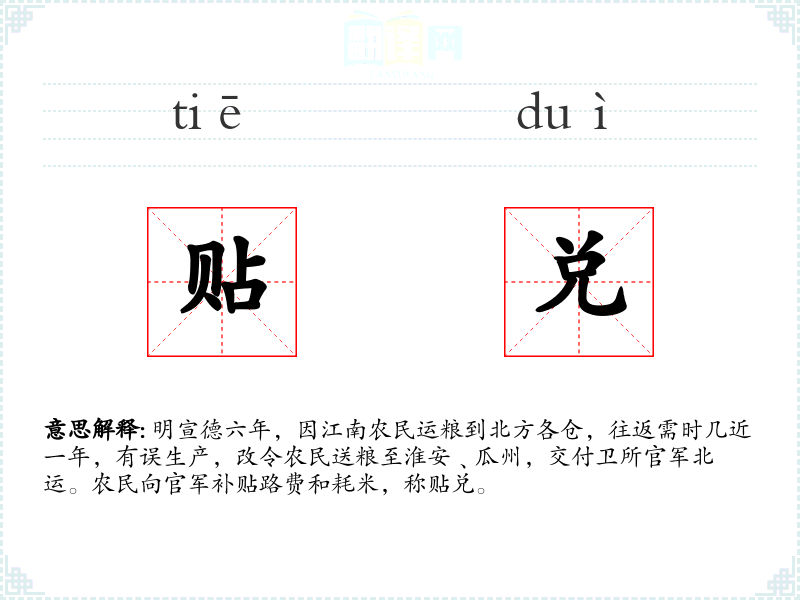 明宣德六年,因江南农民运粮到北方各仓,往返需时几近一年,有误生产,改令农民送粮至淮安﹑瓜州,交付卫所官军北运。农民向官军补贴路费和耗米,称贴兑。