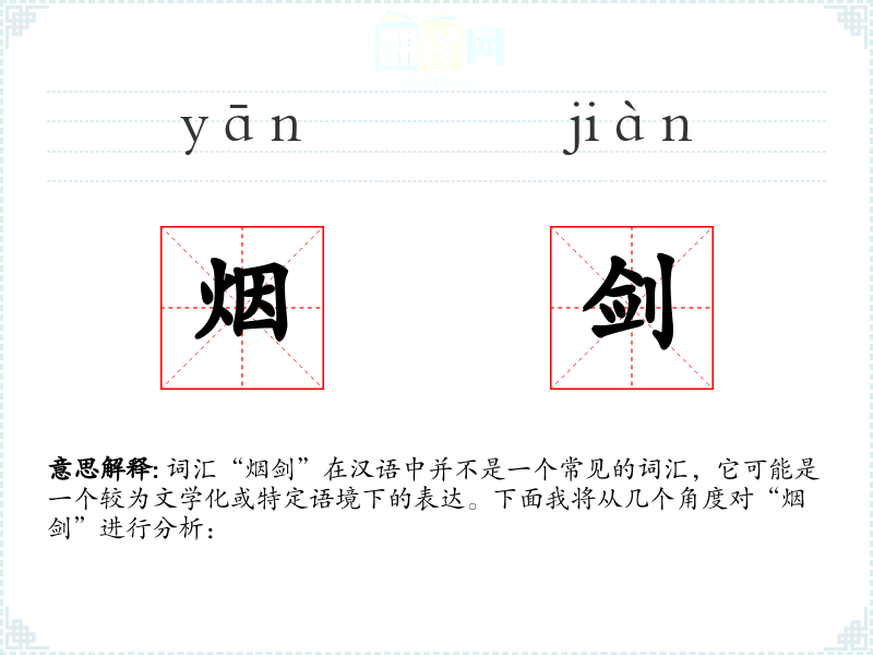 词汇“烟剑”在汉语中并不是一个常见的词汇,它可能是一个较为文学化或特定语境下的表达。下面我将从几个角度对“烟剑”进行分析: