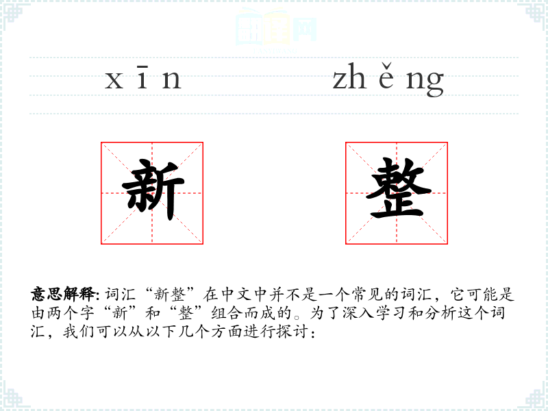 由于“新整”不是一个常用词汇,它在不同语境下的使用可能非常有限。在某些情况下,它可能被用来形容某物既新鲜又整齐,或者指对某物进行新的整理或整顿。