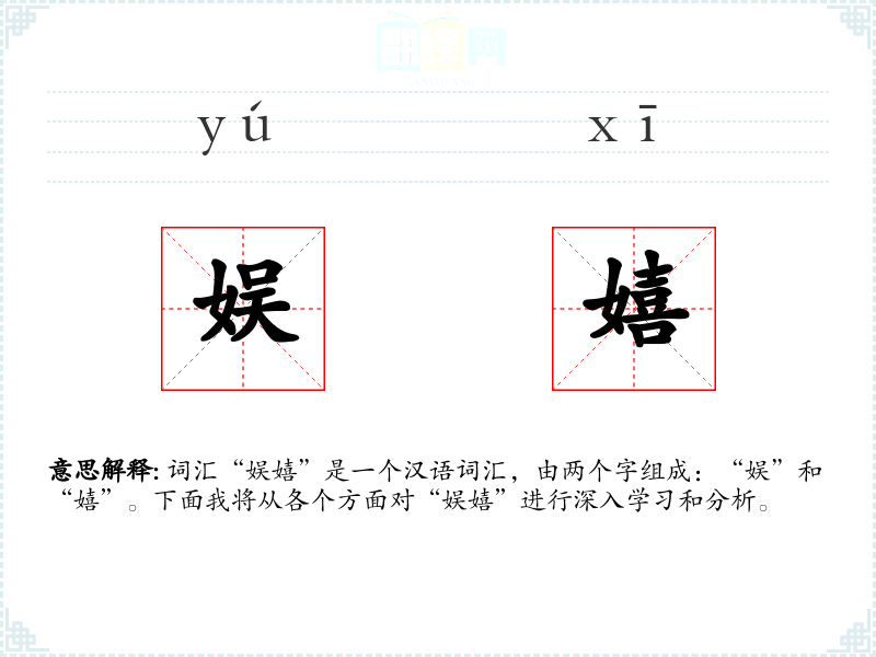 “娱嬉”字面意思是指娱乐和嬉戏,通常用来描述轻松愉快的活动,旨在消遣和娱乐。