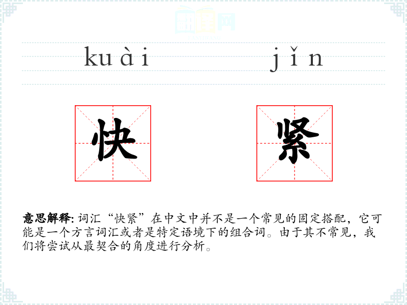 由于“快紧”不是一个标准词汇,它在不同语境下的使用可能非常有限。在某些方言中,它可能用来形容某人做事迅速且紧张,或者在紧急情况下迅速采取行动。