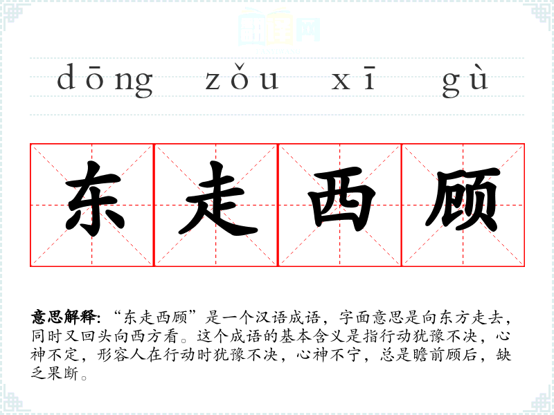 “东走西顾”这个成语的词源较为模糊,但它反映了古代**人对方向的敏感和对行动的审慎态度。随着时间的推移,这个成语的含义逐渐固定,成为描述犹豫不决状态的常用语。