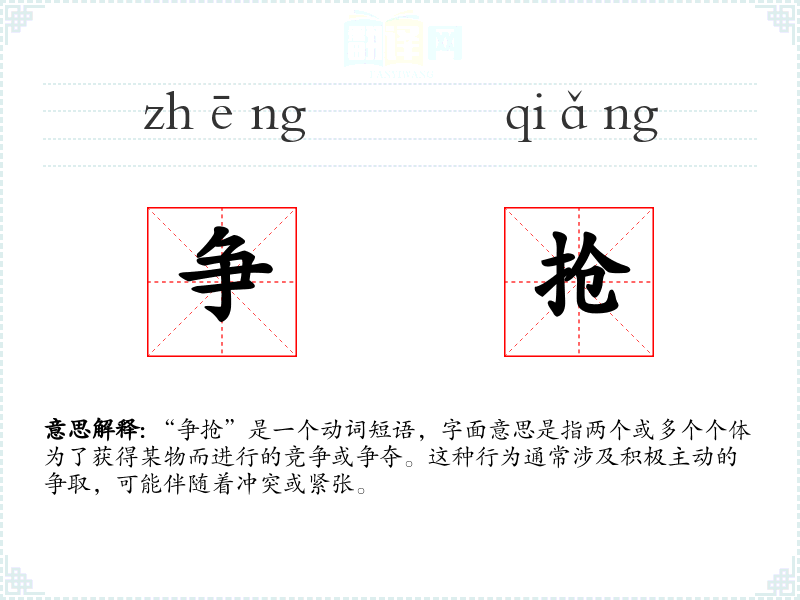“争抢”是一个动词短语,字面意思是指两个或多个个体为了获得某物而进行的竞争或争夺。这种行为通常涉及积极主动的争取,可能伴随着冲突或紧张。