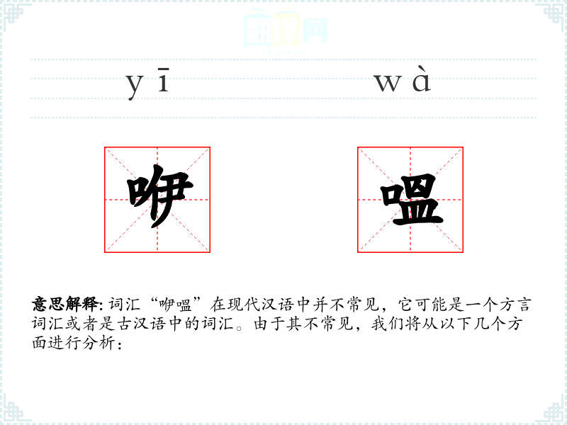 词汇“咿嗢”在现代汉语中并不常见,它可能是一个方言词汇或者是古汉语中的词汇。由于其不常见,我们将从以下几个方面进行分析: