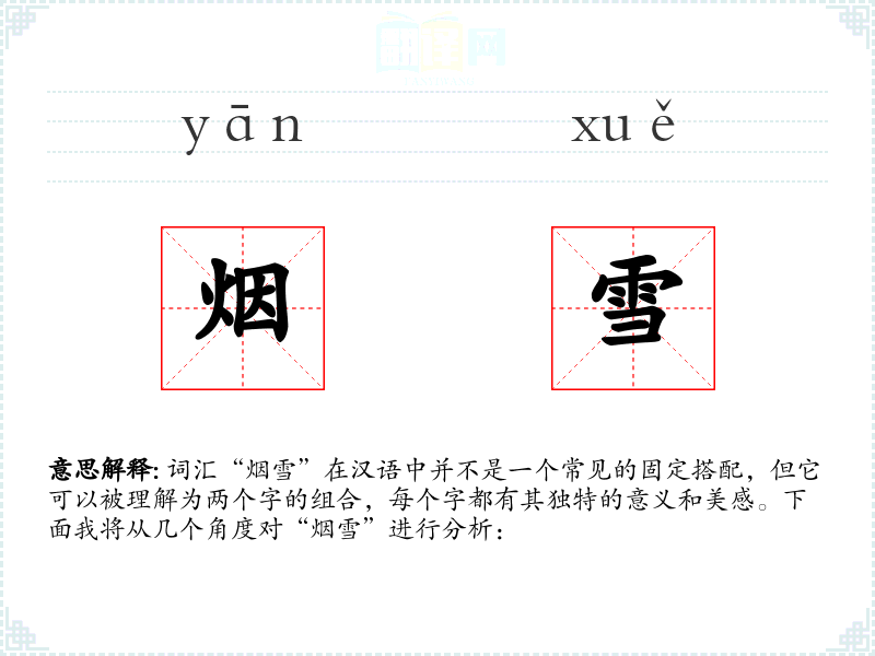 - “烟雪”这个词虽然不常见,但它提供了一种独特的表达方式,可以用来形容那些难以用常规词汇描述的景象。在语言学*和表达中,掌握这样的词汇可以丰富我们的表达能力。