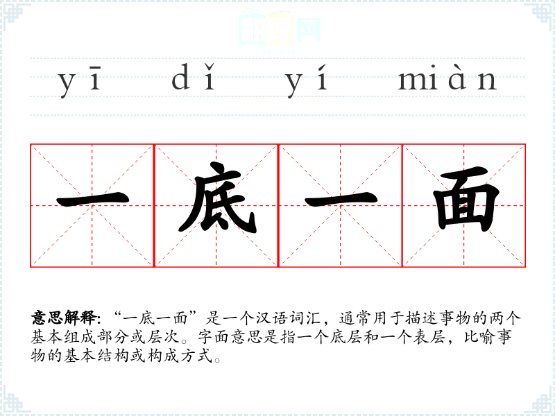 “一底一面”是一个汉语词汇,通常用于描述事物的两个基本组成部分或层次。字面意思是指一个底层和一个表层,比喻事物的基本结构或构成方式。