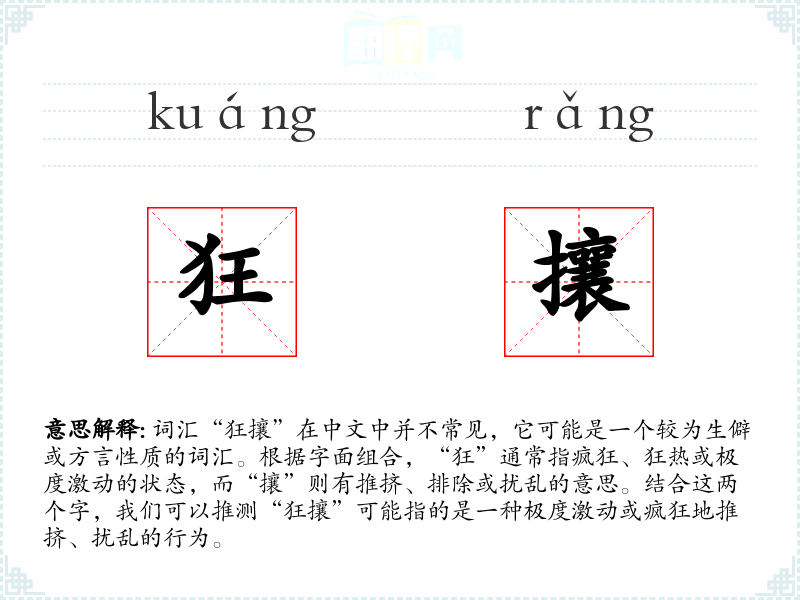 词汇“狂攘”在中文中并不常见,它可能是一个较为生僻或方言性质的词汇。根据字面组合,“狂”通常指疯狂、狂热或极度激动的状态,而“攘”则有推挤、排除或扰乱的意思。结合这两个字,我们可以推测“狂攘”可能指的是一种极度激动或疯狂地推挤、扰乱的行为。