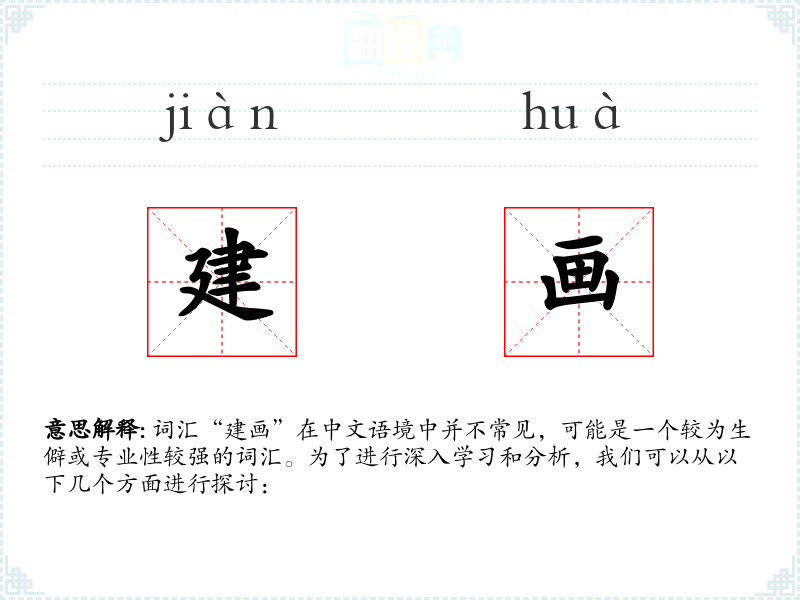词汇“建画”在中文语境中并不常见,可能是一个较为生僻或专业性较强的词汇。为了进行深入学习和分析,我们可以从以下几个方面进行探讨: