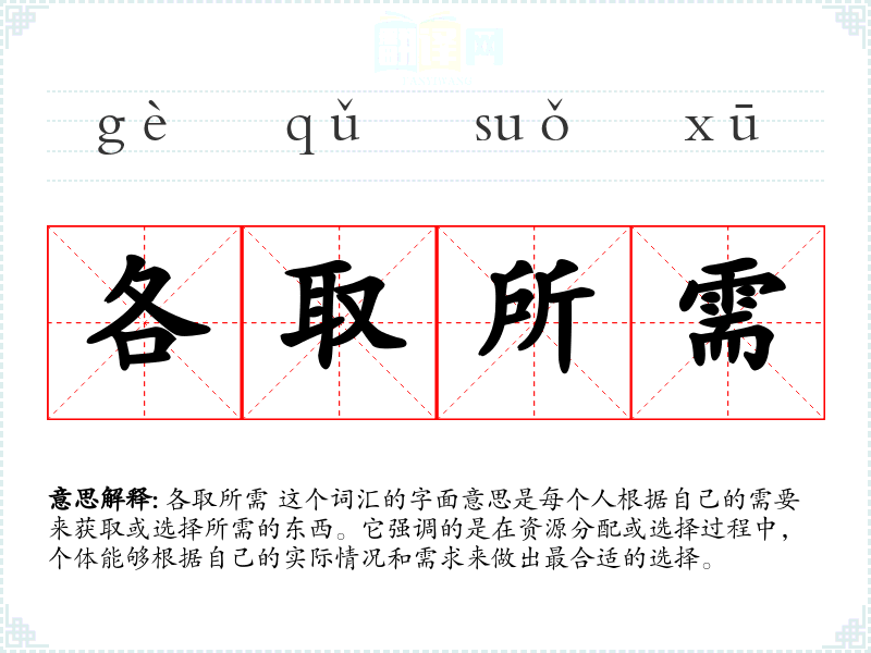 各取所需 这个词汇的字面意思是每个人根据自己的需要来获取或选择所需的东西。它强调的是在资源分配或选择过程中,个体能够根据自己的实际情况和需求来做出最合适的选择。