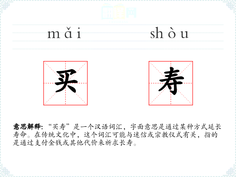 “买寿”是一个汉语词汇,字面意思是通过某种方式延长寿命。在传统文化中,这个词汇可能与迷信或**仪式有关,指的是通过支付金钱或其他代价来祈求长寿。