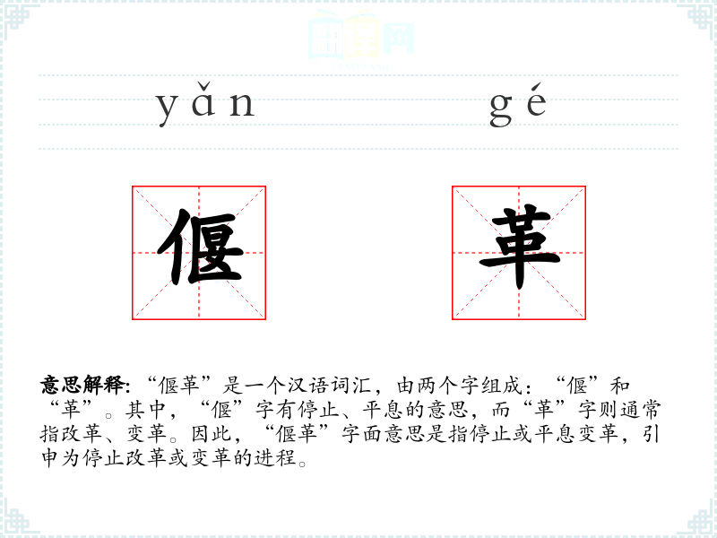 “偃革”是一个汉语词汇,由两个字组成:“偃”和“革”。其中,“偃”字有停止、平息的意思,而“革”字则通常指改革、变革。因此,“偃革”字面意思是指停止或平息变革,引申为停止改革或变革的进程。