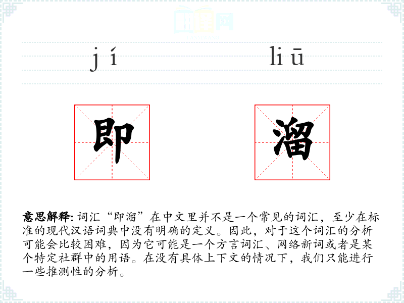 由于“即溜”不是一个标准词汇,我们无法给出一个确切的字面意思和基本含义。它可能是由“即”和“溜”两个字组合而成的,其中“即”通常表示立即、马上,而“溜”则有滑行、迅速离开的意思。结合起来,可能意味着“立即迅速离开”。