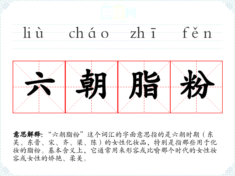 “六朝脂粉”这个词汇的字面意思指的是六朝时期(东吴、东晋、宋、齐、梁、陈)的女性化妆品,特别是指那些用于化妆的脂粉。基本含义上,它通常用来形容或比喻那个时代的女性妆容或女性的娇艳、柔美。