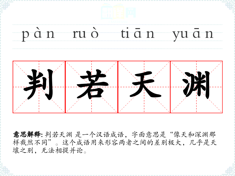 判若天渊 是一个汉语成语,字面意思是“像天和深渊那样截然不同”。这个成语用来形容两者之间的差别极大,几乎是天壤之别,无法相提并论。